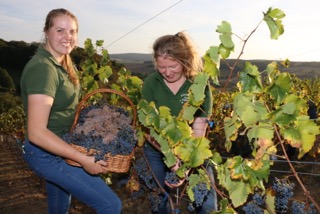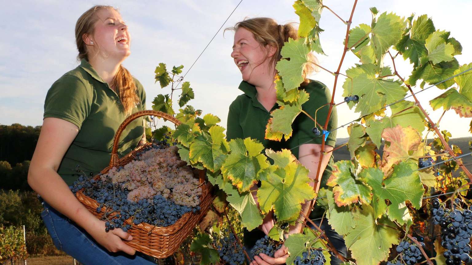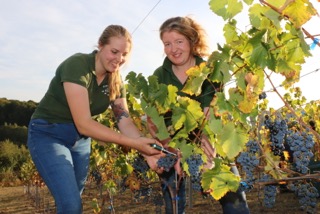 Mehrstündiger Ernteeinsatz: Amelie Hartung( links) und Lilo-Charlott Fülling hatten reichlich Spaß bei der ersten Weinlese auf dem Zwerger Osterberg. 200 Kilogramm Trauben haben die 500 jungen Weinpflanzen aus dem Vorjahr gebracht.